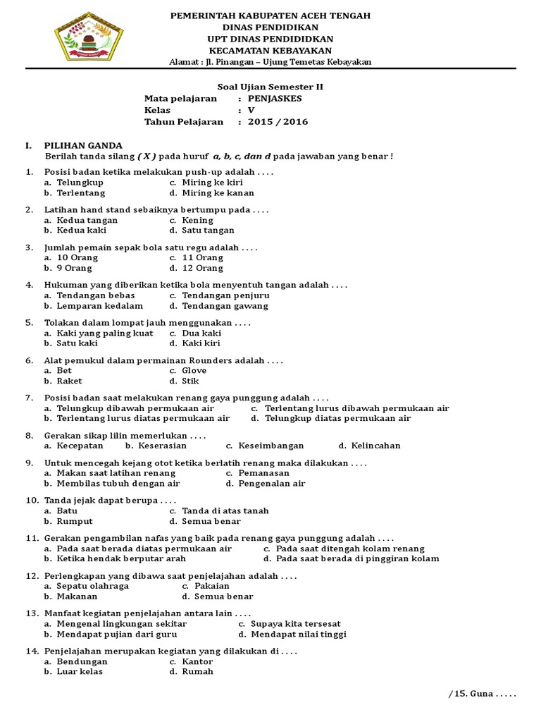 Download Soal UH PJOK Kelas 1 Tema 7 Semester 2 K13 Revisi ...
